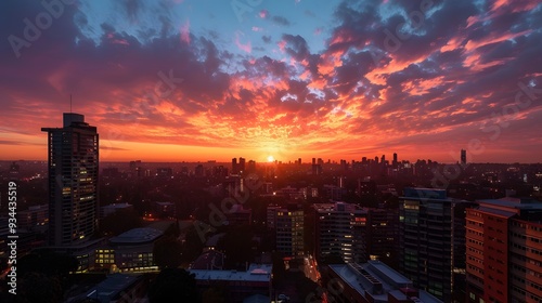 Fototapeta premium A vibrant sunset over a shimmering city skyline viewed from a high vantage...