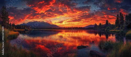 Obraz premium A vibrant sunset over a tranquil lake, reflecting fiery clouds and a mountain...