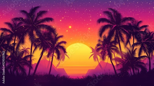 Naklejka premium A vibrant sunset over a tropical landscape with palm trees and mountains.