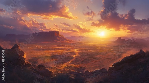 © Rere_Art151, Fototapeta premium A Vibrant Sunset Over a Vast Desert Landscape