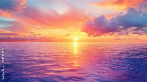 Fototapeta premium A vibrant sunset over calm ocean waters, showcasing beautiful colors and...