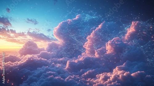 Fototapeta premium A vibrant sunset over interconnected clouds, showcasing digital network