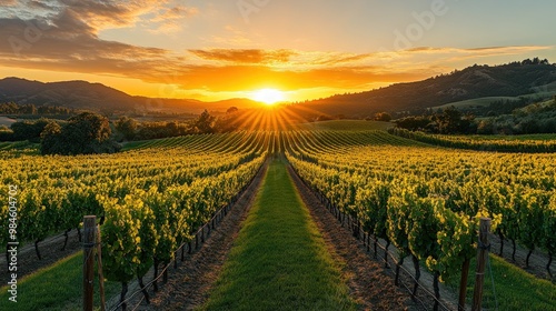 © Lexyat, Fototapeta premium A vibrant sunset over rolling hills, casting golden light on rows of grapevines in a picturesque vineyard.