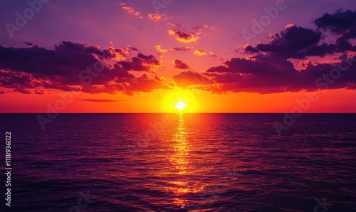 © Lensa, Naklejka premium A vibrant sunset over the ocean, casting colorful reflections on the water.