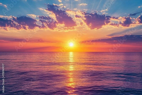 © Mosaic, Obraz premium A vibrant sunset over the ocean, casting colorful reflections on the water.