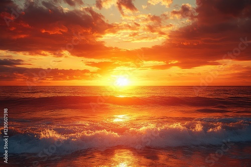 © Najeeb, Fototapeta premium A vibrant sunset over the ocean, with dramatic clouds and golden light