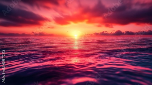 © BloomArt, Fototapeta premium A vibrant sunset over the ocean with dramatic, colorful clouds reflecting in the water.