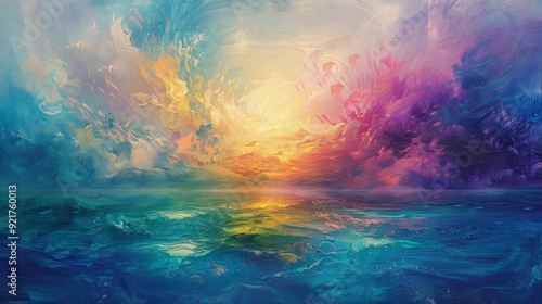 © Oatkhaphon, Fototapeta premium A vibrant sunset over the ocean, with swirling colors of blue, orange, and purple, evokes a sense of tranquility and wonder. The emotional expression is one of peace and awe.