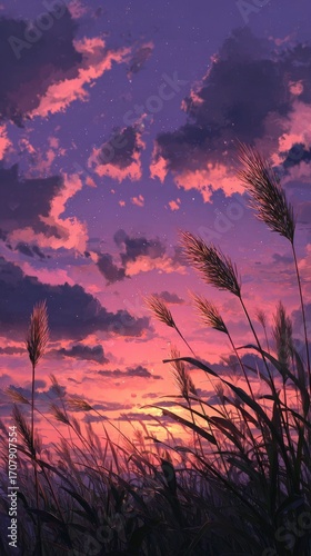 © Ibnu, Fototapeta premium A vibrant sunset painted across a dusky sky, casting warm hues upon tall grasses swaying gently in the breeze. The sun's glow partially obscured by clouds