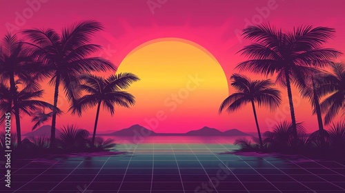 Naklejka premium A vibrant sunset scene featuring palm trees silhouetted against a colorful...