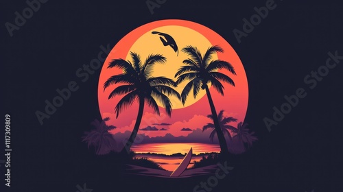 © Gerbang, Naklejka premium A vibrant sunset scene with palm trees, a surfer, and a tranquil ocean view.