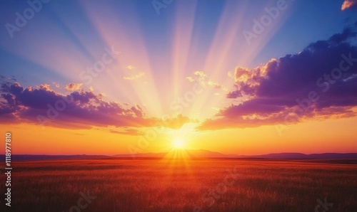 © Oxi, Obraz premium A vibrant sunset with rays of light illuminating a serene landscape.