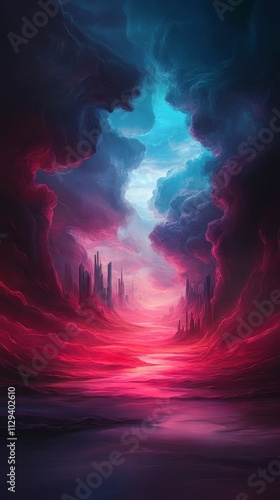 © soysuwan123, Fototapeta premium A vibrant, surreal landscape showcasing dramatic skies with swirling clouds and a striking horizon of pink and blue hues.