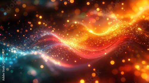 © Kaizenart, Obraz premium A vibrant swirl of colorful light particles creating a dynamic wave effect against a dark background