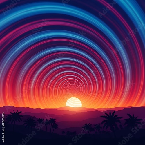 Naklejka premium A vibrant, swirling sunset landscape with concentric rings of colorful light,...