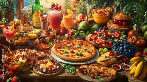 Fototapeta premium A vibrant tapestry of culinary delights, featuring an array of delectable dishes and refreshing beverages. From savory pizzas to tantalizing desserts, this visual feast showcases the diversity