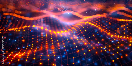 Naklejka premium A vibrant technology-themed abstract background with a dynamic orange and blue grid network, highlighted by glowing points of light, creating a futuristic and energetic visual.