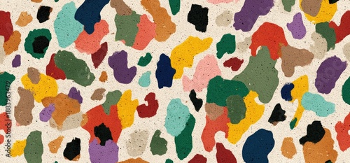 © Alfais, Obraz premium A vibrant terrazzo pattern featuring irregular organic shapes in various colors against a speckled off-white background