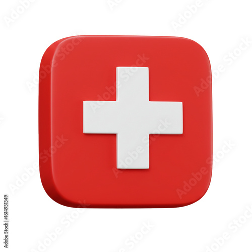 © nadialia, Obraz premium A vibrant three-dimensional emblem featuring a bold red square with rounded corners and a prominent central cross symbol.