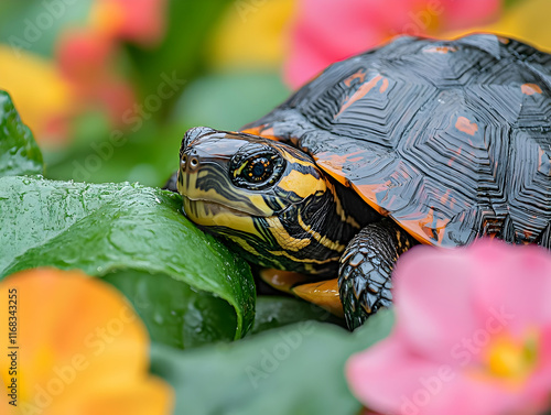 Obraz premium A vibrant tortoise resting on lush green leaves surrounded by colorful...
