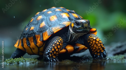 Fototapeta premium A vibrant tortoise with orange and black patterns in a natural setting.