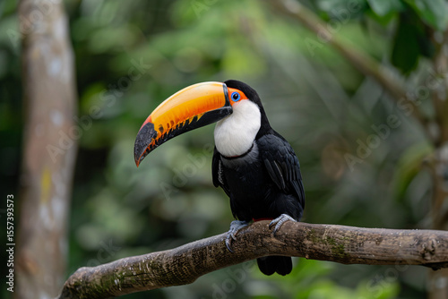 Naklejka premium A vibrant toucan perched on a branch, showcasing its striking orange and black plumage amidst lush greenery.