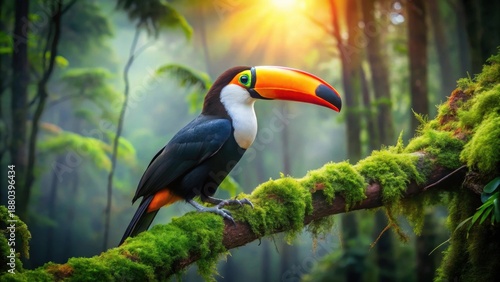 Obraz premium A Vibrant Toucan Perched on a Mossy Branch in a Lush, Sun-Drenched Rainforest