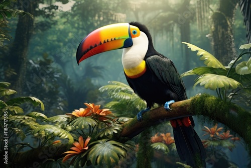 Naklejka premium A vibrant toucan perches on a branch amidst colorful flowers in the lush Amazon Rainforest during the early morning light