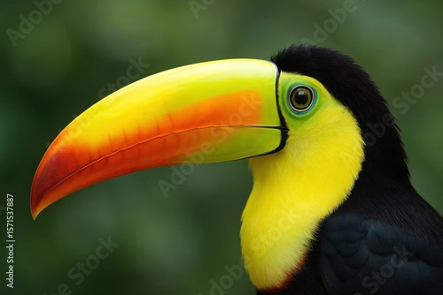 © Oleg, Fototapeta premium A vibrant Toucan with a striking yellow beak stands out against a blurred green backdrop, capturing the essence of its vivid plumage and gentle demeanor