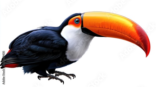 Naklejka premium A vibrant toucan with black, white, and orange plumage stands against a white...