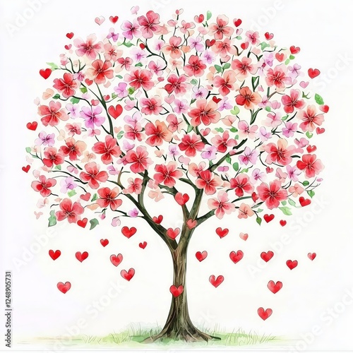 Fototapeta premium A vibrant tree adorned with pink flowers and red hearts, symbolizing love and...