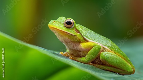 © zhongyou, Obraz premium A vibrant tree frog rests on a tropical leaf, embodying nature's delicate beauty.