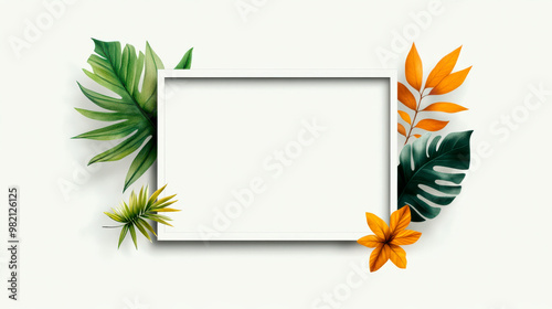 © Supranee, Fototapeta premium A vibrant, tropical frame featuring colorful leaves and flowers, perfect for adding a fresh touch to any design or presentation.