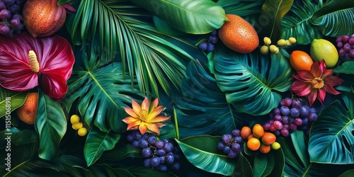 © Ahmad, Naklejka premium A vibrant tropical setting showcasing unique and unusual leaves complemented by an array of colorful fruits highlighting the exotic atmosphere.