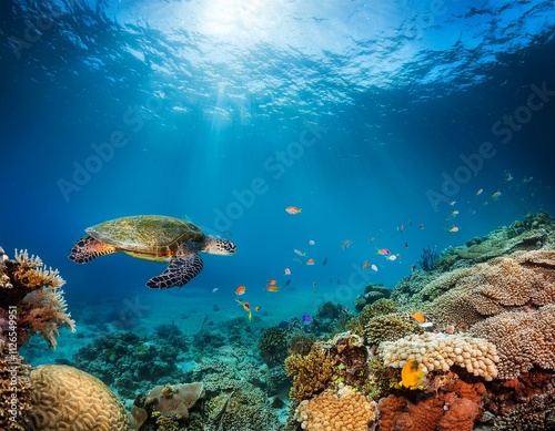 Fototapeta premium A vibrant tropical underwater scene with colorful coral, exotic fish, and sea turtles, illuminated by sunlight, perfect for marine and travel designs