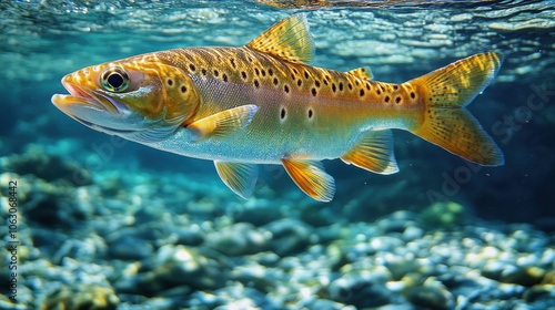 Naklejka premium A vibrant trout swimming in clear water over a rocky bottom.