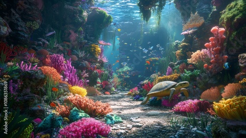 Naklejka premium A vibrant turtle glides through a bustling coral reef, surrounded by a...
