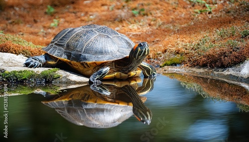 © LIGHTFIELD STUDIOS, Fototapeta premium A vibrant turtle lounges on a rock by a serene pond surrounded by nature.