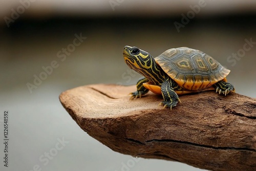 Obraz premium A vibrant turtle perched on a wooden log above calm waters, basking in the...