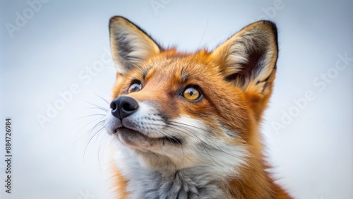 © DigitalArt Max, Obraz premium A vibrant two-year-old red fox with a curious expression looks upwards, solitary against a pristine white background.