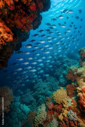 Naklejka premium A vibrant underwater ecosystem teeming with life, showcasing a school of fish...