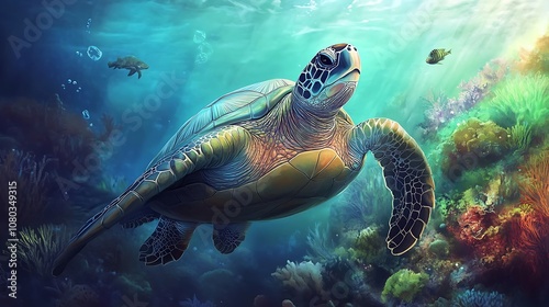 Fototapeta premium A vibrant underwater scene featuring a turtle swimming among colorful coral...