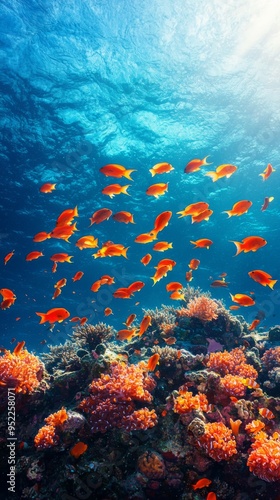 Naklejka premium A vibrant underwater scene featuring colorful fish swimming above stunning...