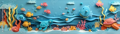 Naklejka premium A vibrant underwater scene featuring paper art fish, a turtle, and coral in a...