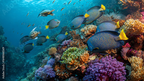 Fototapeta premium A vibrant underwater scene with a group of angelfish, wrasses, and sea...