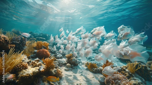 Naklejka premium A vibrant underwater scene with a school of fish swimming over a colorful...