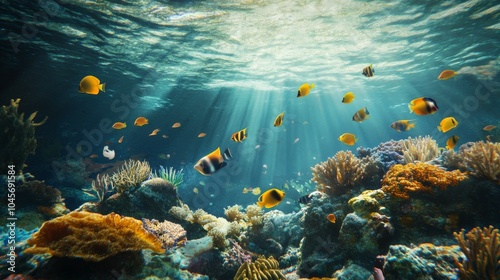 Naklejka premium A vibrant underwater scene with colorful coral reefs and a school of fish swimming through sunbeams.