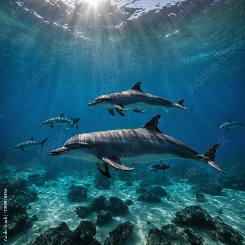 © Muhammad, Fototapeta premium A vibrant underwater scene with dolphins playfully swimming.