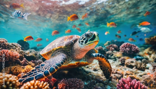 Fototapeta premium A Vibrant Underwater World A Turtle Surrounded by Colorful Fish and Sea...