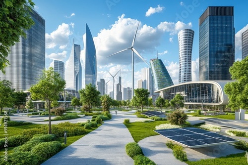Obraz premium A vibrant urban landscape showcasing modern architecture, greenery, wind turbines, and solar panels under a bright blue sky.